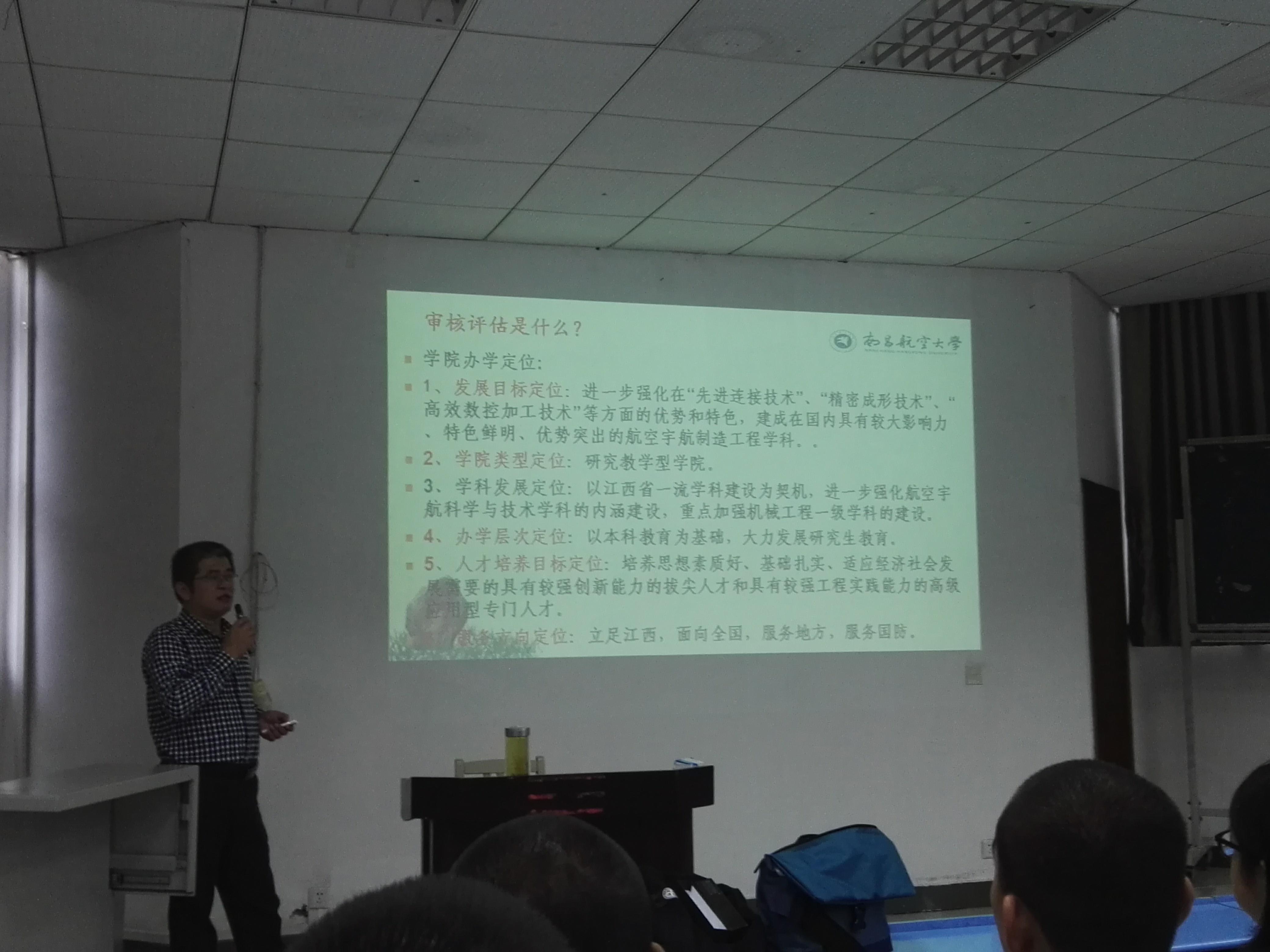 为进一步推进学校本科教学审核评估工作,调整好学生迎评促建的状态,切实做好迎评冲刺阶段相关的学生工作,解决近期学校迎评促建工作所暴露出来的学生在学习、生活等方面存在的主要问题和不足,努力实现学院全体学生以最佳的状态接受评估,以最好的评价通过评估。航空制造工程学院学生党总支于10月25日举行了一次专题党员活动日的活动,在F100教室学院学生党总支召开了“迎评冲刺阶段促进会”,活动由学院学生党总支副书记谢强主持,学院党委副书记、学生党总支书记吴海勤老师做专题报告。来自学院200多名本科生党员、“两委会”干部、新生教官聆听了学院党委副书记吴海勤老师做的的精彩报告。